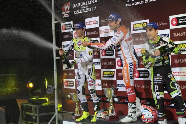 En tête au premier tour de qualification de ce X-Trial de Barcelone, puis impérial en finale, Toni Bou a, comme d’habitude, survolé cette ouverture du mondial X-Trial à Barcelone. Ce qui fait sa 9e victoire de suite dans cette salle, la 11e en tout… Genre de domination ! Derrière, on retrouve également les mêmes, toujours à peu près dans le même ordre, d’ailleurs. A savoir Adam Raga, second, devant Jeroni Fajardo, qui en profite pour signer son premier podium X-Trial avec sa nouvelle Vertigo. Le dernier qualifié en finale est un abonné également, en la personne de Cabestany. Premier non-qualifié, Jaime Busto complète la main mise espagnole sur cette ouverture catalane…