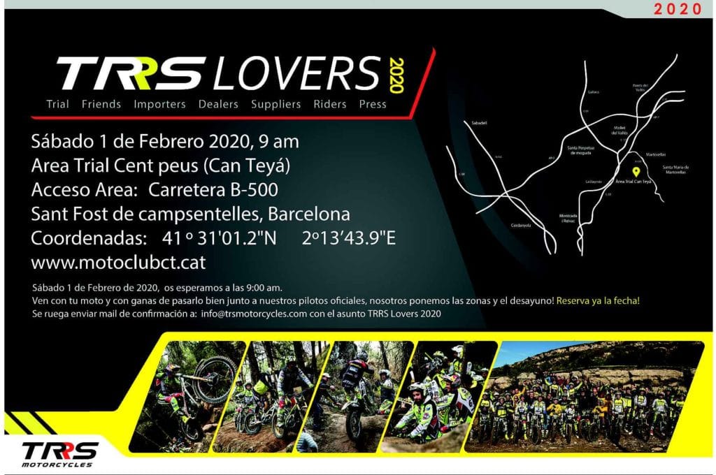 nous vous confirmons la tenue de la journée TRRS Lovers, samedi 1er février. Le RV est fixé à l’Area de Trial del Motoclub CentPeus, à 10 minutes de Barcelone et à une demi-heure de l’usine TRRS.