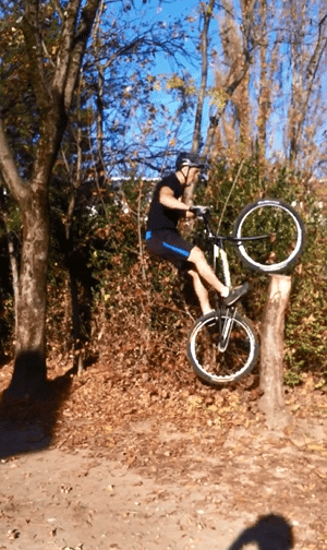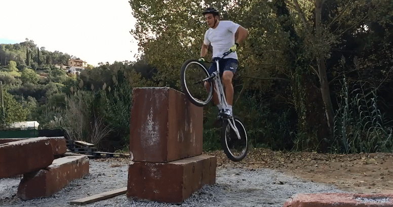 Vtt trial : Superbe passage latéral d’un marche par Sergi Llongueras. Pendant ce temps Aurélien Fontenoy se prend pour un singe.