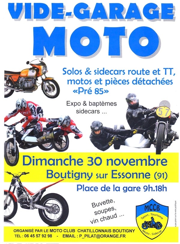 Le M.C. Chatillon-Boutigny vous propose LA solution : le dimanche 30 novembre, le MCCB organise à Boutigny sur Essonne (91, parking de la gare) un grand vide-garage destiné aux motos et sidecars de vitesse et de TT, aux routières antérieures à 1985, ainsi qu’aux pièces, équipements et accessoires moto.