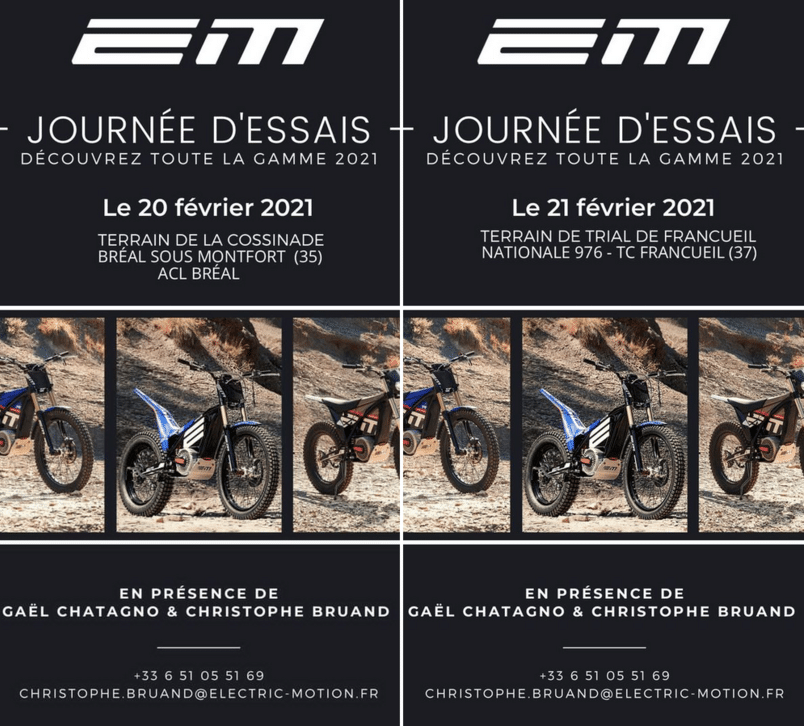 En effet, le samedi 20/02, il vous est proposé d’essayer la gamme Electric Motion sur le terrain de Bréal sous Montfort. Avec pour vous conseiller, rien moins que Chris Bruand et Gaël Chatagno : pas mal, non ?