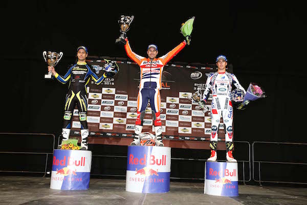 X-Trial Sheffield. Round 1 Championnat du Monde de X-Trial 2015. Toni Bou (Montesa) s’est imposé lors de l’ouverture du Mondial de trial indoor hier à Sheffield en Grande-Bretagne. Déjà huit fois champion du monde de la discipline, Toni Bou a ajouté une vingt-septième victoire à son palmarès. Le podium est une nouvelle fois 100% espagnol avec Albert Cabestany (Sherco) et Adam Raga (Gas Gas) sur les 2e et 3e marche.
