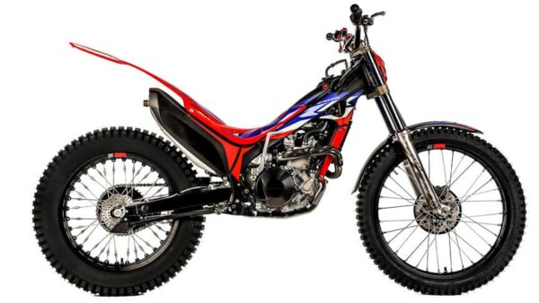 La Cota 301RR présente un tout nouveau design tricolore rouge, bleu et blanc inspiré par HRC. La Cota 301RR et la Race Replica comportent tous deux une nouvelle pince triple usinée. En plus du design, une autre amélioration pour le modèle 2024 est la nouvelle pince triple usinée et anodisée, fini en gris titane. Plus léger et plus fort que le modèle précédent, basé sur l’expérience de la compétition. Par ailleurs, la Cota 301RR hérite aussi du moteur de la moto qui concourt au championnat du monde Trial2.